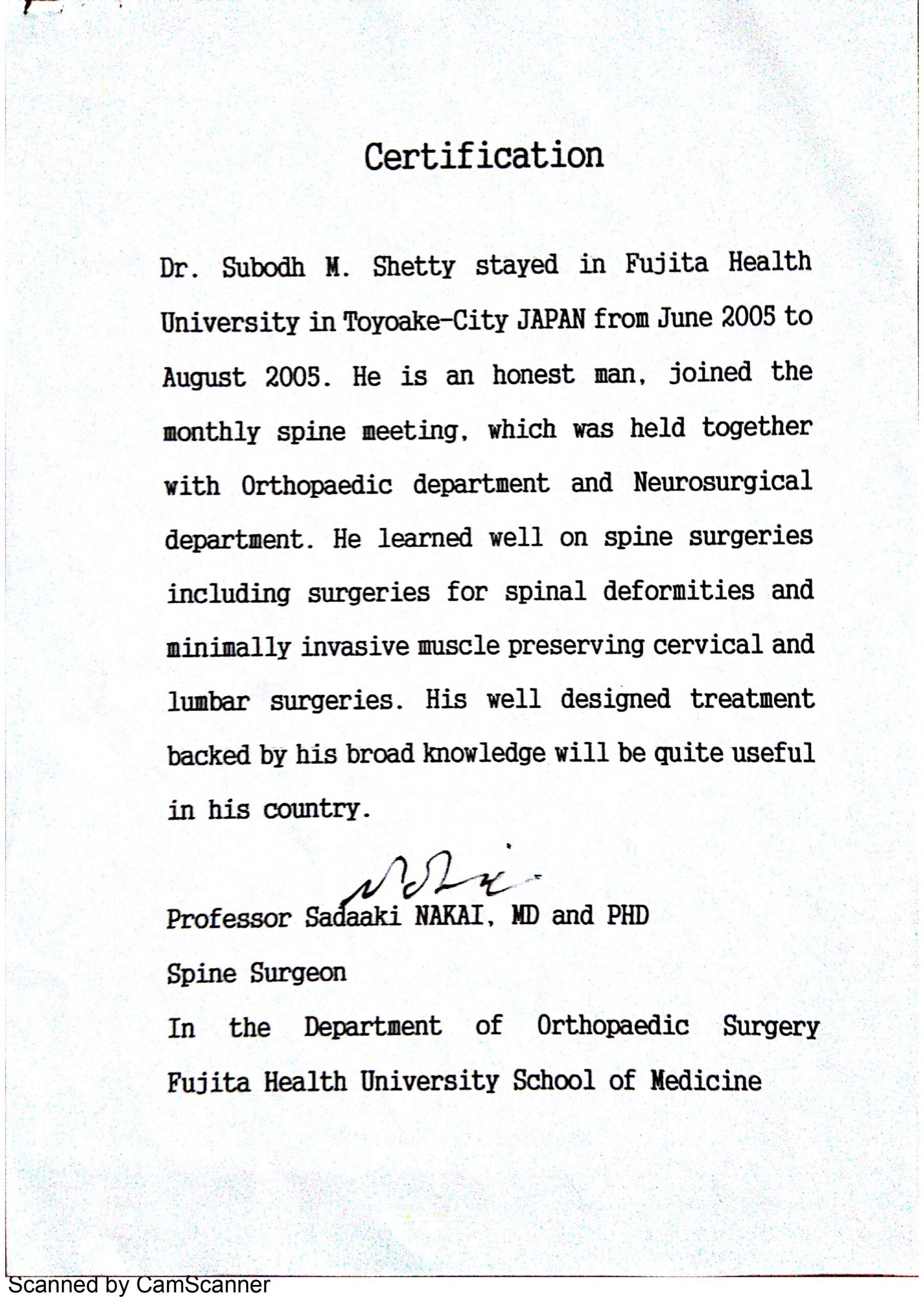 Dr. Shetty’s dedication to his craft has taken him to different parts of the world, where he has continued to hone his skills and deepen his knowledge. He has trained under renowned spine surgeons, including Prof. P.S. Ramanani in Mumbai and Prof. Motai Shoda and Prof. Sadaaki Nakai at Fujita Health University (Nagoya, Japan), among others.