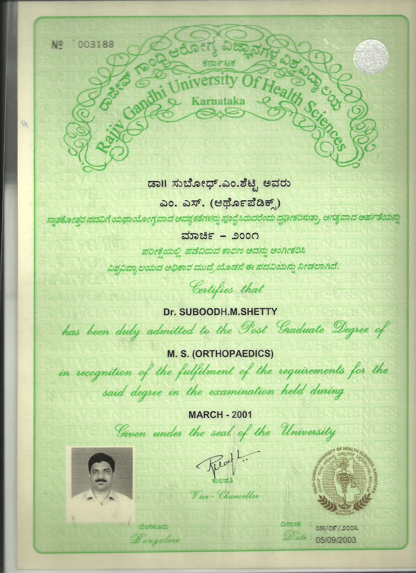 Dr. Shetty’s passion for excellence has driven him to become a highly accomplished orthopedic surgeon. He pursued further expertise by completing his Master’s in Orthopedic training at Jawaharlal Nehru Medical College (KLE University) and gained invaluable experience as a registrar under Prof. Shantaram Shetty at the Shantaram Shetty Institute of Orthopaedics and Traumatology (Mangalore).